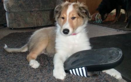 Billie lernt sehr schnell und ist nun nach 4 Wochen schon stubenrein. Sie ist sehr lebhaft im Spiel, aber trotzdem ruhig im Haus und fügt sich leicht in das "Rudel" ein. Manchmal liegt sie einfach nur da und beobachtet. Billie ist total lieb und sehr gelehrig. Sie hat schon sitz und platz gelernt und das Wort nein versteht sie auch, obwohl sie da manchmal nachmault und mich anbellt, wenn ich es sage. :-)) In der Hundeschule werden nun auch schon immer ein paar Übungsminuten eingebaut, bei denen sie mit Freude dabei ist. Wir sind schon ganz gespannt, wie sie sich weiter entwickelt und freuen uns auf die kommende Zeit.
