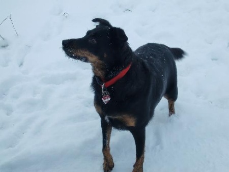 Gina ist eine Mischlingshündin, Eltern unbekannt. Wir übernahmen sie damals als Dobermann-Mix. Aber schon nach kurzer Zeit kamen Zweifel auf, da sie recht kräftig gebaut ist. Wir hatten schon viele Ideen z.B. Schäfer-Terrier-Mix, Rottweiler-Mix, Labrador-Mix, aber es wird wohl immer ein Geheimnis bleiben. Sie ist einfach unsere Gina.