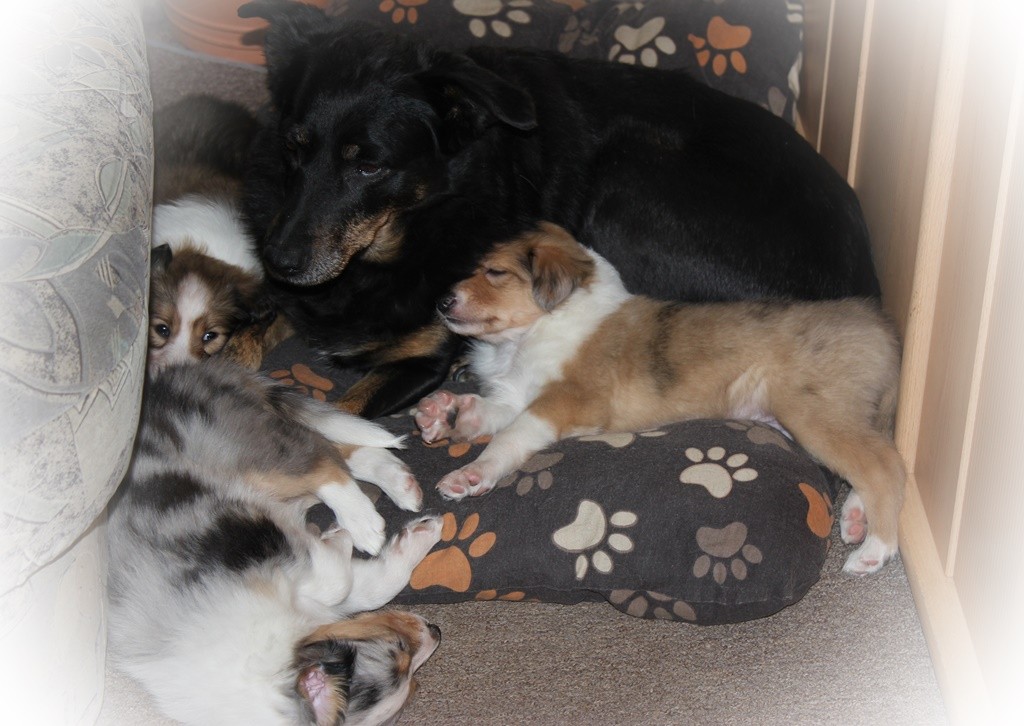 Unseren Zwergen gehts super gut. Sie nutzen inzwischen das gesamte Zimmer und schlafen nun auch nachts außerhalb der Welpenbox. Billie nutzt ab und zu nochmal die Box zum säugen, aber sobald die Zwerge fertig getrunken haben, gehts ganz schnell wieder raus! Sie erzieht nun auch für uns hör-und sichtbar die Kleinen und geht dazwischen, wenn sich 2-3 knurrend in die Wolle bekommen, oder zeigt den Kleinen deutlich, dass die Milchbar nun nicht mehr uneingeschränkt zur Verfügung steht. Auch macht sie den Babys klar, wer das Sagen hat und nimmt ihnen ab und an mal ein Spielzeug ab oder unterbricht sogar ein Spiel. Aber sie liegt auch oft einfach so mit im Welpenzimmer und beobachtet ihre Kinder.