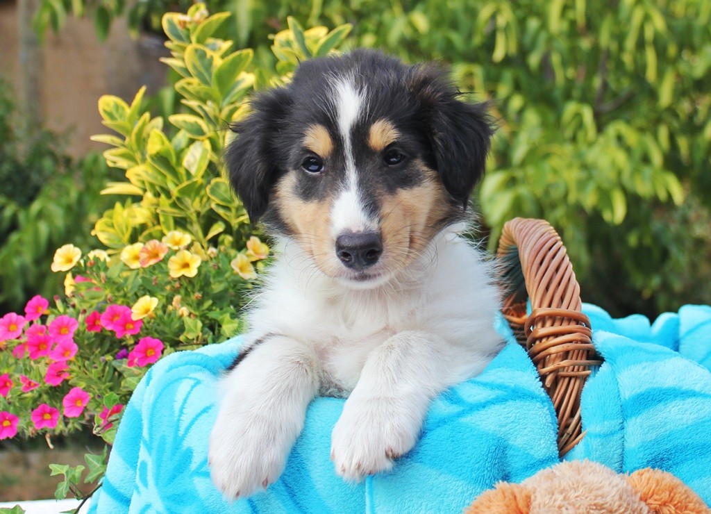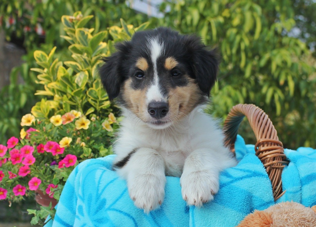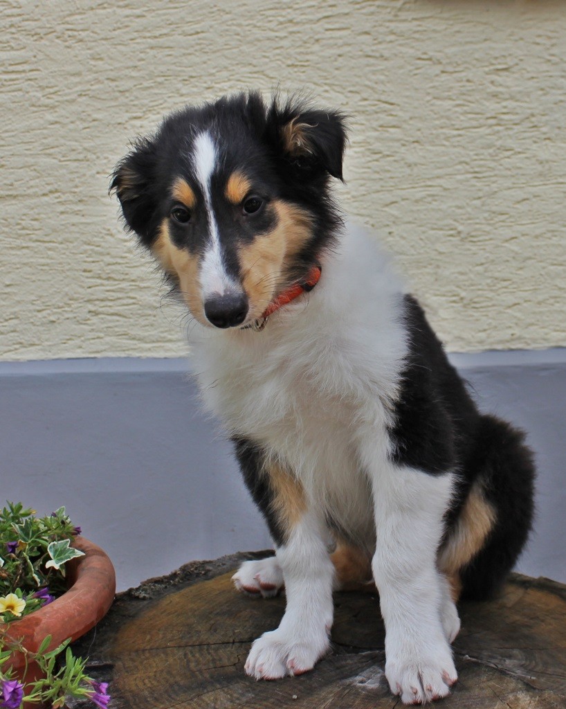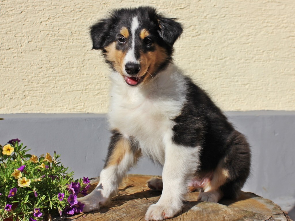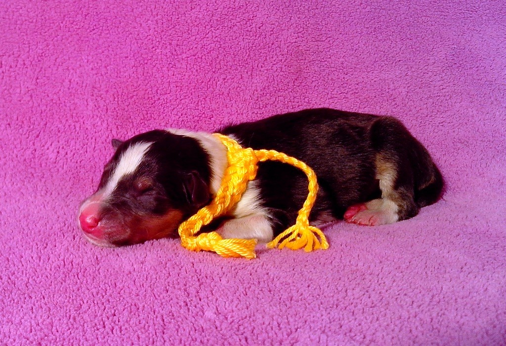 Er hat eine wunderschöne tricolor Zeichnung, mit toller breiter weißer Halskrause und einer schönen Blesse. Er war agil und suchte sofort nach der Milchbar und saugte sich fest ;)