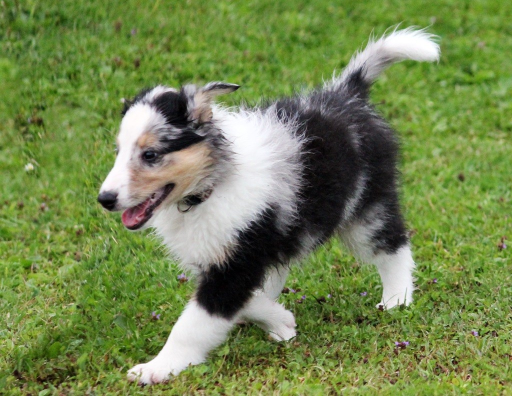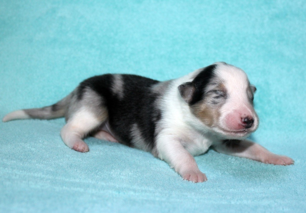 Franz wurde um 23.18Uhr am 01.06.17 mit einem Gewicht von 321g geboren. Seine Farbe ist blue-merle mit Weißfaktor. Auffällig ist seine große Blesse und die großen schwarzen Flecke in seinem Fell!