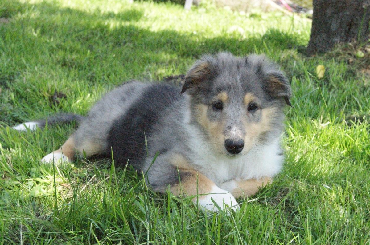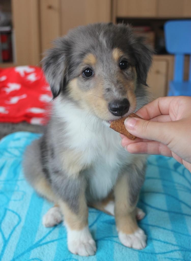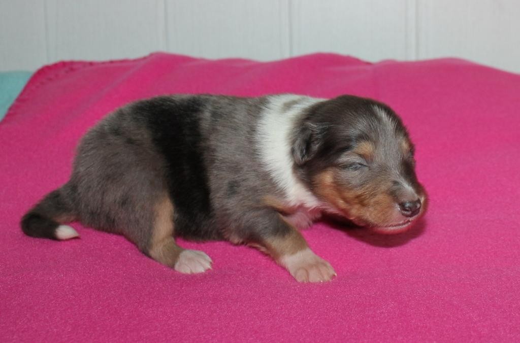 She was born at 7:30 o' clock. She was an eyecatcher because of her slightly darker blue-merle and blue merle colored point in her white ruff. She was like all the others very agile.
