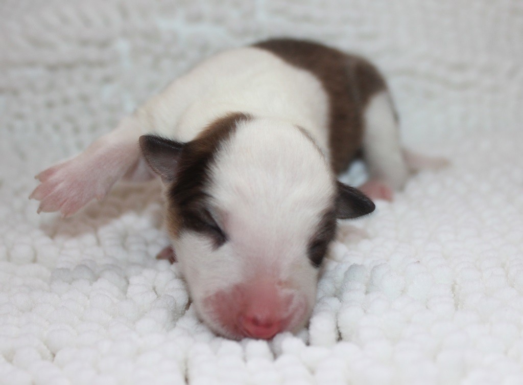 Sie wurde um 10.40 Uhr mit einem Gewicht von 293g geboren. Ihre Farbe ist darksable und sie ist weißfaktoriert. Auffällig ist ihre sehr breite weiße Blesse. Sie war direkt sehr aktiv und suchte die Milchbar!